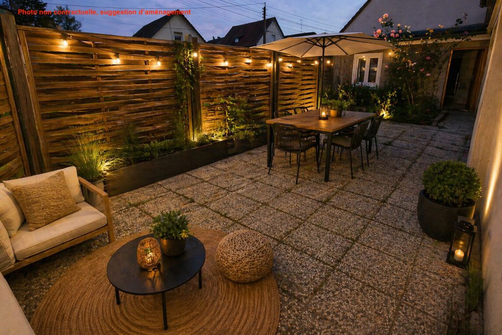 D’une surface d’environ 96 m² habitables, édifiée sur un terrain de 3,41 ares, elle se compose au rez-de-chaussée d’une entrée, d’une buanderie, d’une pièce de vie lumineuse ouverte sur la cuisine avec accès direct à la terrasse, d’une salle de bains avec WC ainsi que d’un espace débarras.